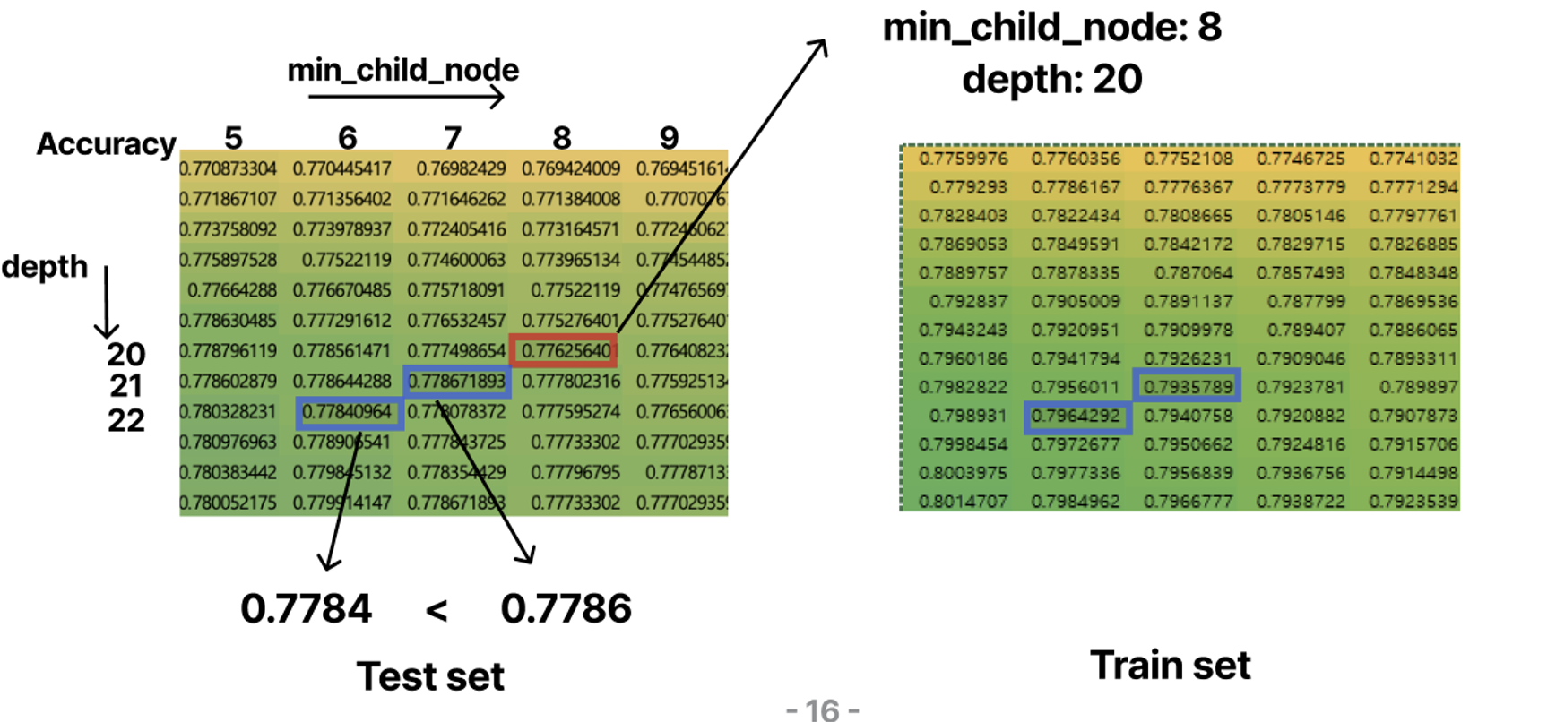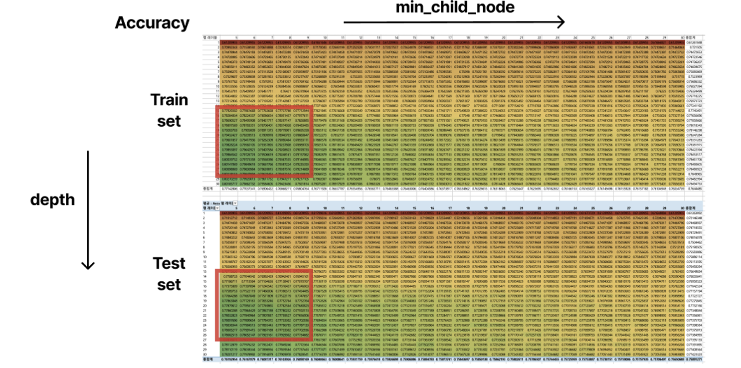우선 depth와 min_node를 조절하면서 가장 좋은 값을 찾고자 하였고