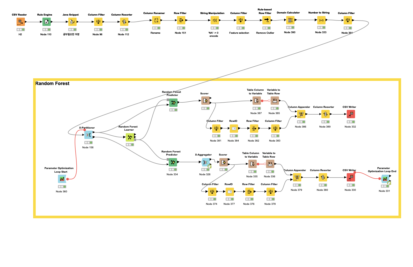 하이퍼파라미터 값은 parameter optimization loop 노드를 통해서 찾았다.