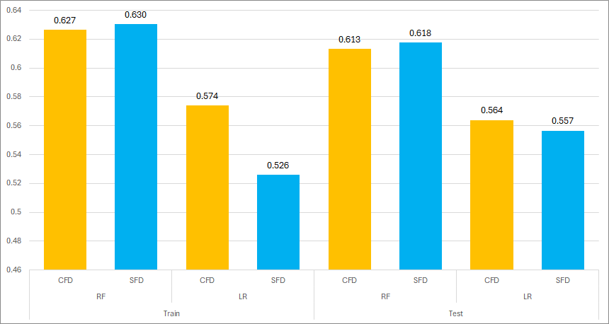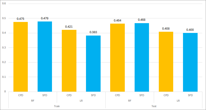 위와 같이 random forest에서는 전반적으로 sfd가 cfd보다 좋은 성능을 낸다는 것을 알 수 있었다.