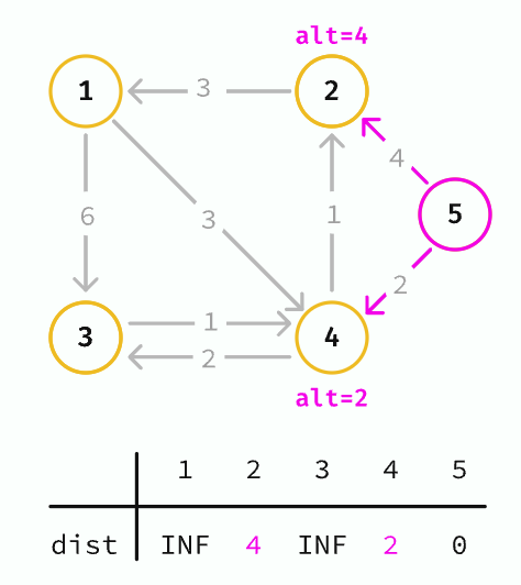 현재 저 배열 내에서 dist 값이 가장 작은 것은 5이므로, 5를 기준으로 나머지 노드 값을 갱신한다.