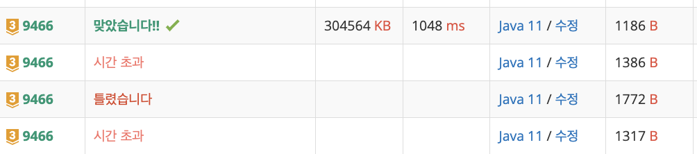 그래서 while문을 통해 계속해서 탐색하다가 이미 방문한 노드를 마주치면 현재 탐색중인 노드와 그 노드가 일치하는지 여부를 보는 방식으로 풀어봤는데 시간초과가 나왔다..