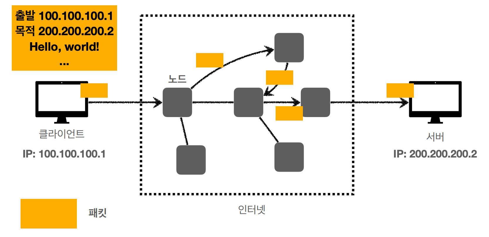 이때 패킷이라는 통신 단위로 데이터를 전달한다.