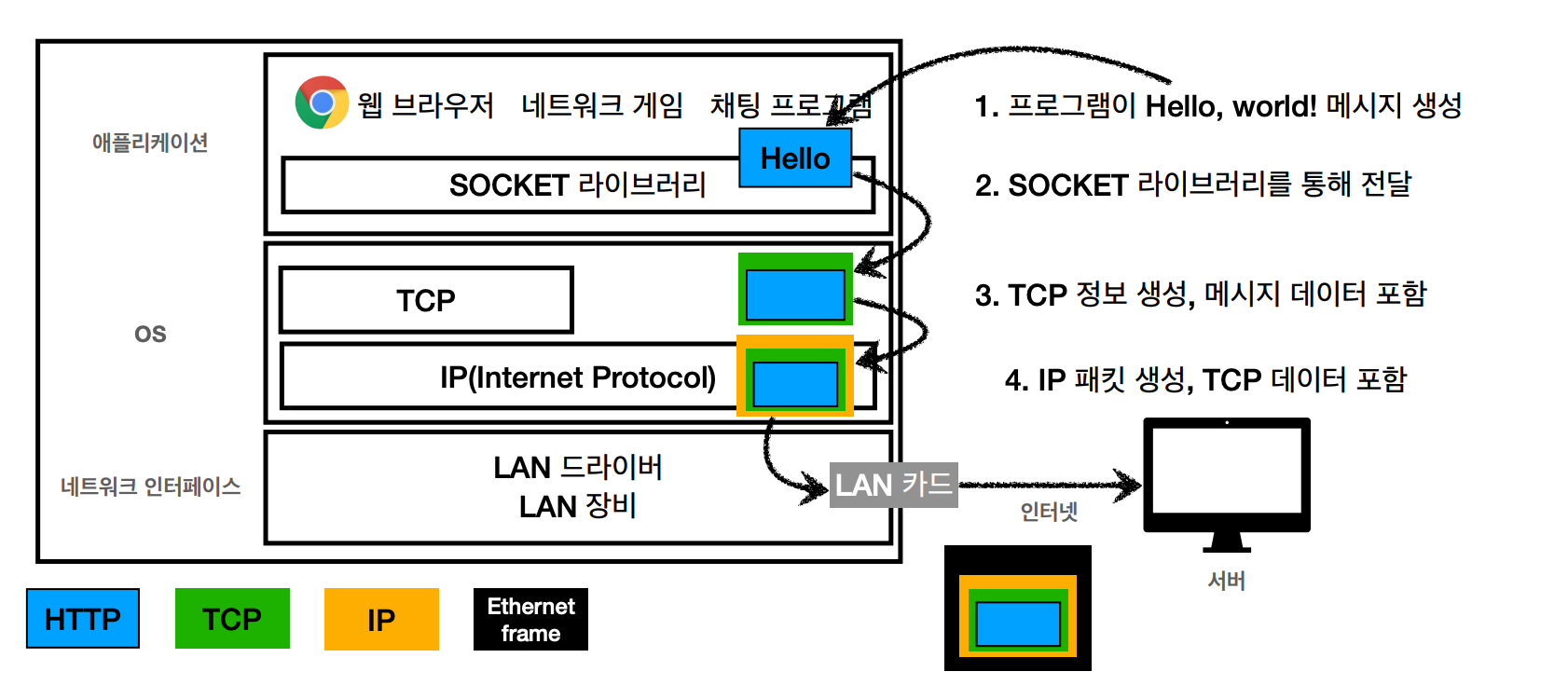 애플리케이션 계층에서는 웹브라우저가 있고, 이 소켓을 OS에 전달한다. 이 때 TCP와 IP정보를 생성하여 패킷을 생성하고, Ethernet frame까지 씌워서 서버에 보낸다.