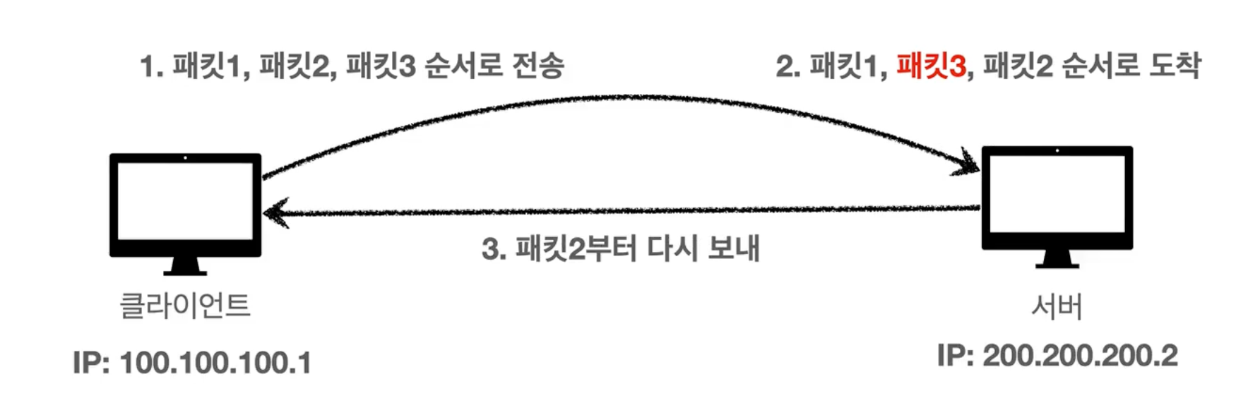 또한 패킷3번이 패킷2번보다 늦게 도착했을 때 패킷 2번부터 다시 보내라는 신호를 보낼 수 있다.