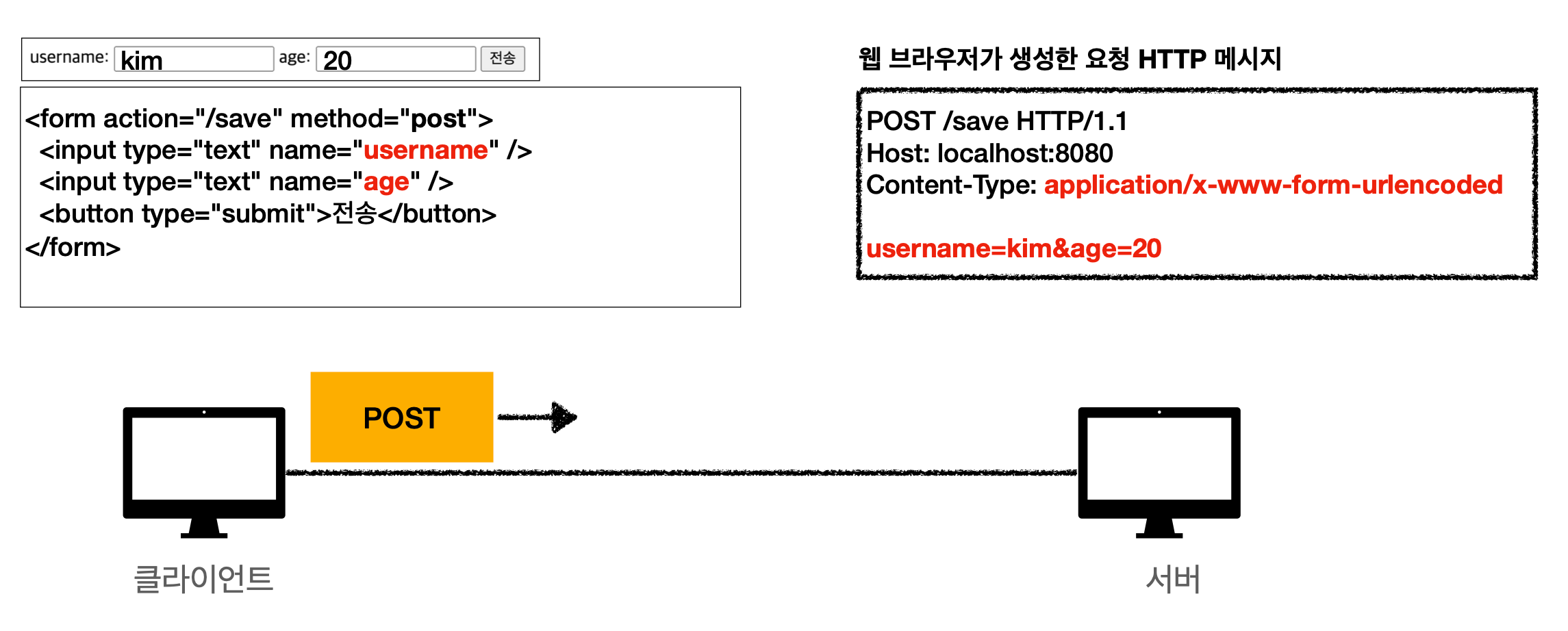 전송 데이터를 url encoding 처리하고, form 내용을 메시지 바디를 통해서 전송한다.(key = value 쿼리 파라미터 형식)