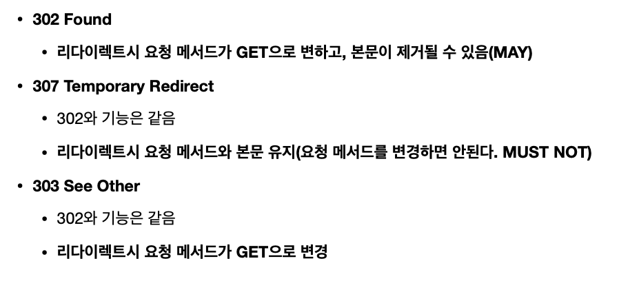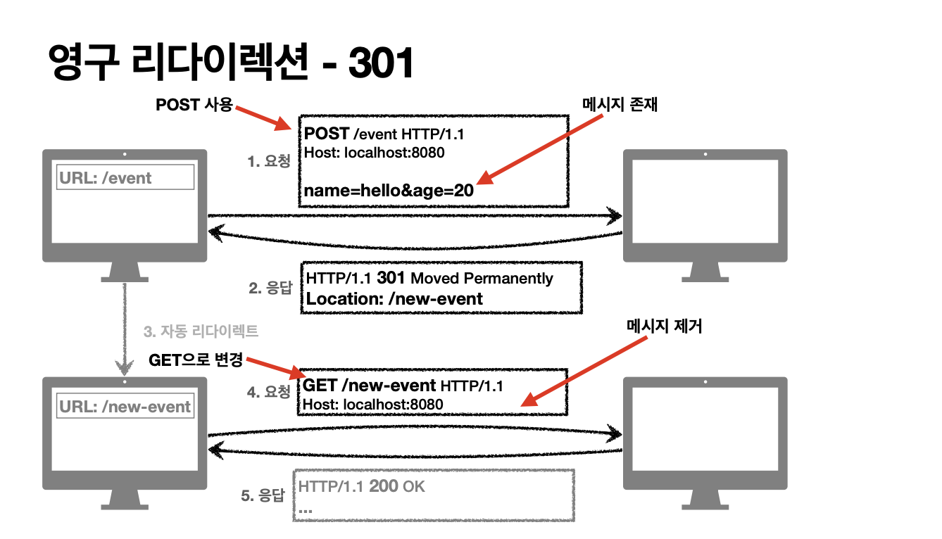 301의 경우 리다이레트 시 요청메서드가 get으로 변하고, 본문이 제거된다.
