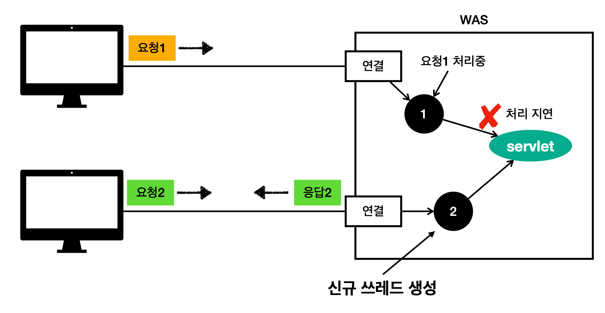 멀티쓰레드에 관한 것은 거의 WAS가 처리해서 개발자가 멀티 쓰레드 관련 코드는 신경쓰지 않아도 된다.