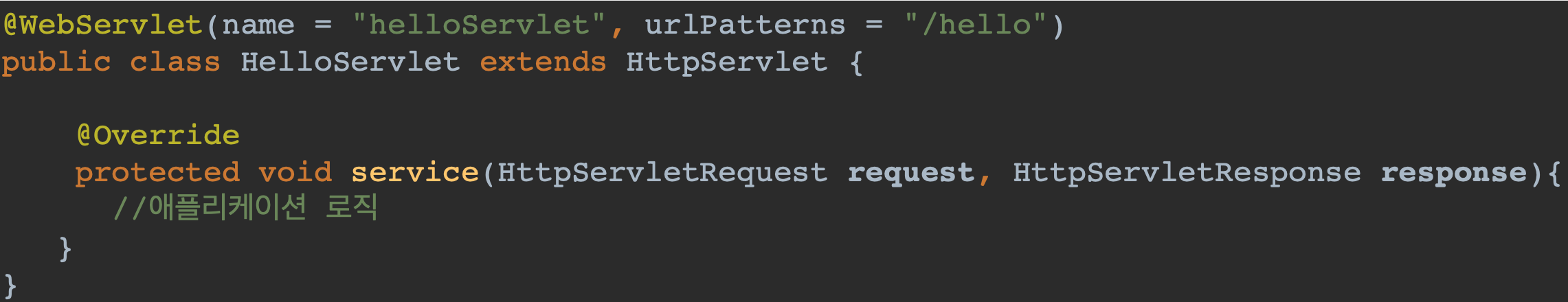 여기서 urlPatterns(/hello)의 URL이 호출되면 서블릿 코드가 실행된다.