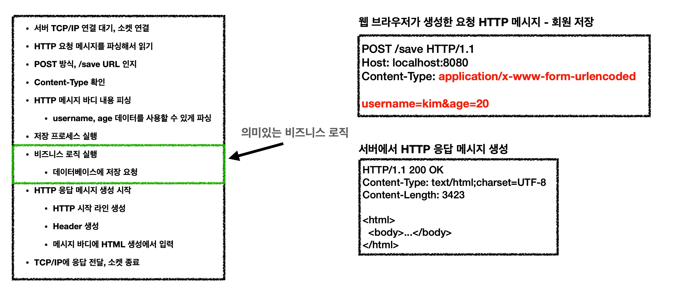 HTTP 메세지 내부의 정보를 읽고, 비지니스 로직을 실행하고, 다시 서버에서 HTTP 응답 메세지를 생성해야한다.
