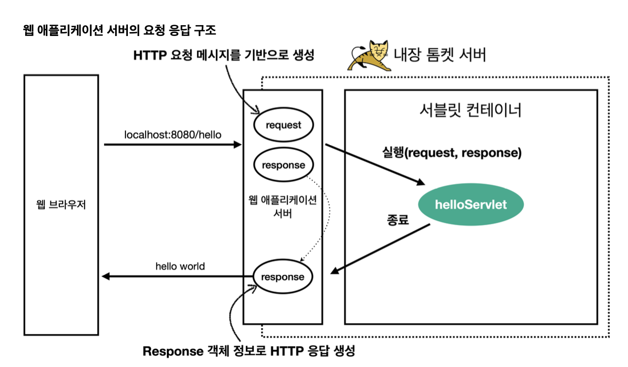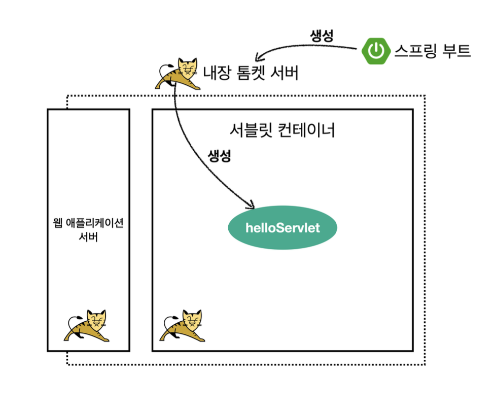 서블릿은 원래 톰캣같은 웹 애플리케이션 서버를 직접 설치하고, 그 위에 서블릿 코드를 클래스 파일로 빌드해서 올린다음 톰캣서버를 실행해야하는데, 스프링부트는 톰캣서버를 내장하고있어서 편리하게 서블릿 코드를 실행할 수 있다.