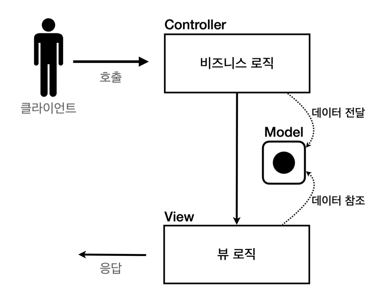 모델 : 뷰에 출력할 데이터를 담아둔다. 뷰가 필요한 데이터를 모두 모델에 담아서 전달해서 뷰는 비지니스 로직이나 데이터 접근을 몰라도 되고, 화면 렌더링에만 집중할 수 있다.