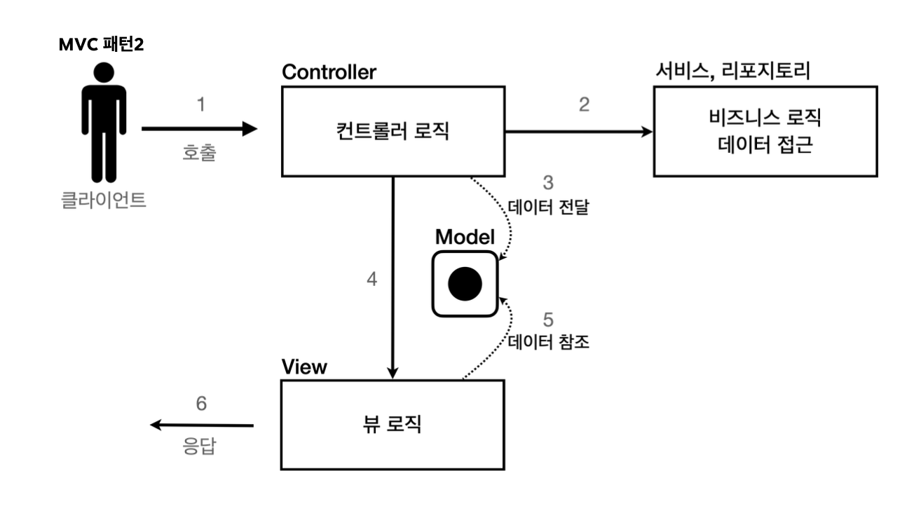 하지만 mvc패턴을 사용하면 controller을 통해서 비지니스 로직을 수행하고, 결과값(데이터)를 model에 담는다.