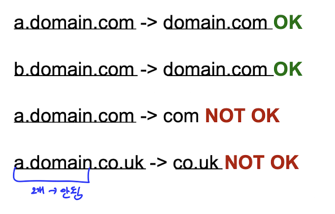 페이지는 자신 또는 부모 도메인에 쿠키를 보낼 수 있다.(public suffix 아니어야 가능)