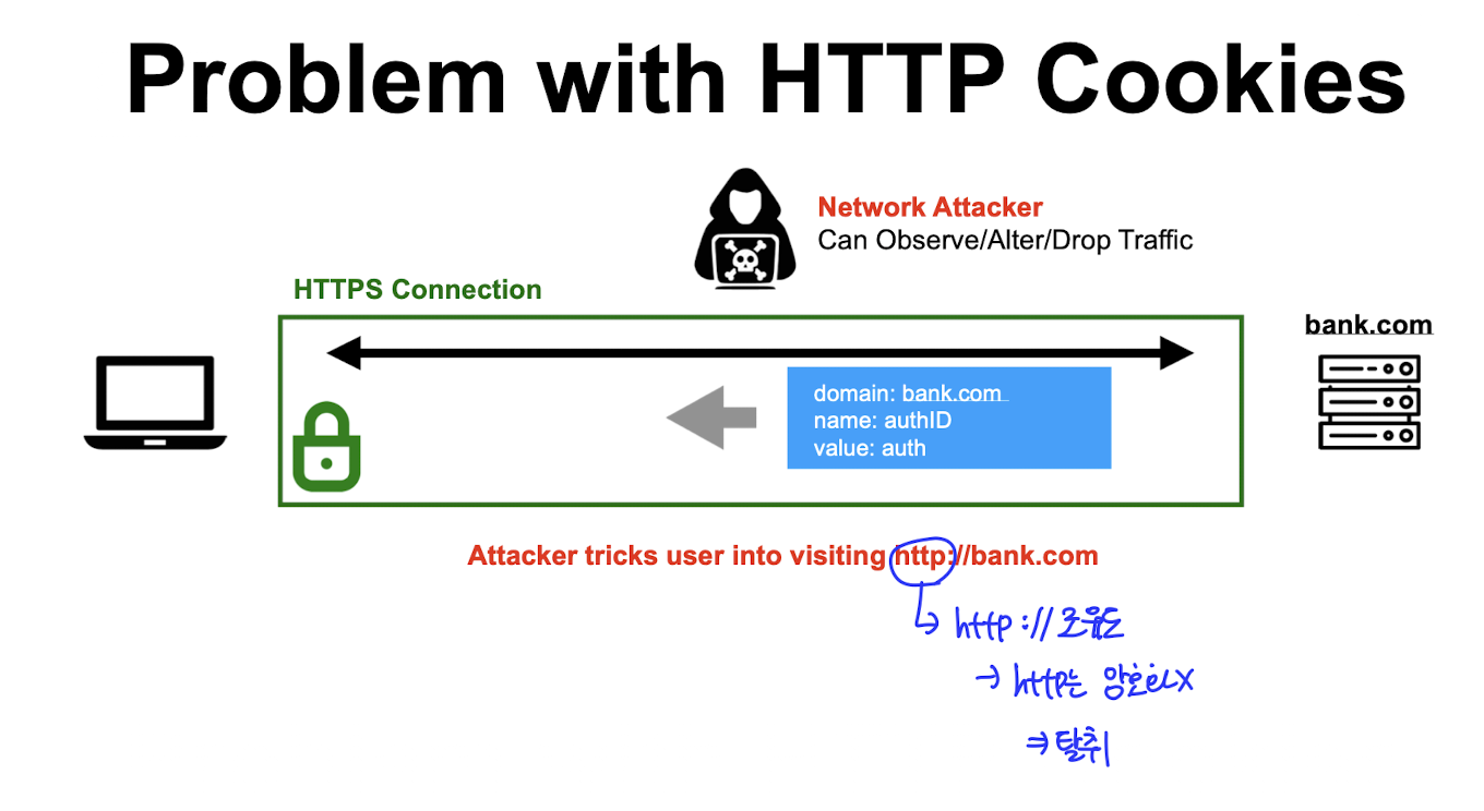 https로 가면 안전한 쿠키를 attacker가 http://로 유도해서 탈취할수도 있다.