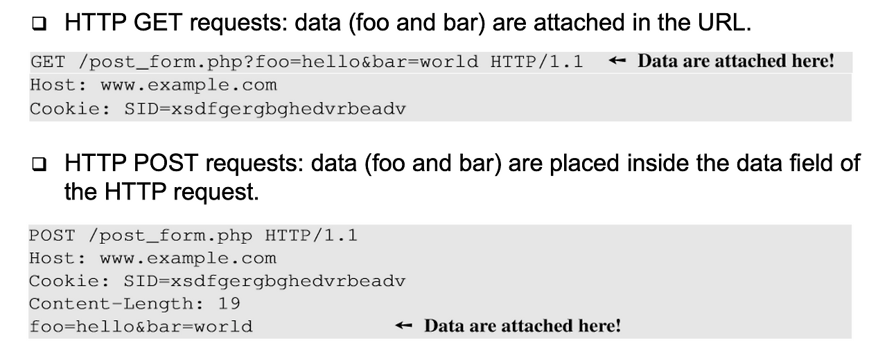 get 요청은 url속 쿼리 문에 데이터를 넣고, post요청은 body에 데이터를 넣는다.