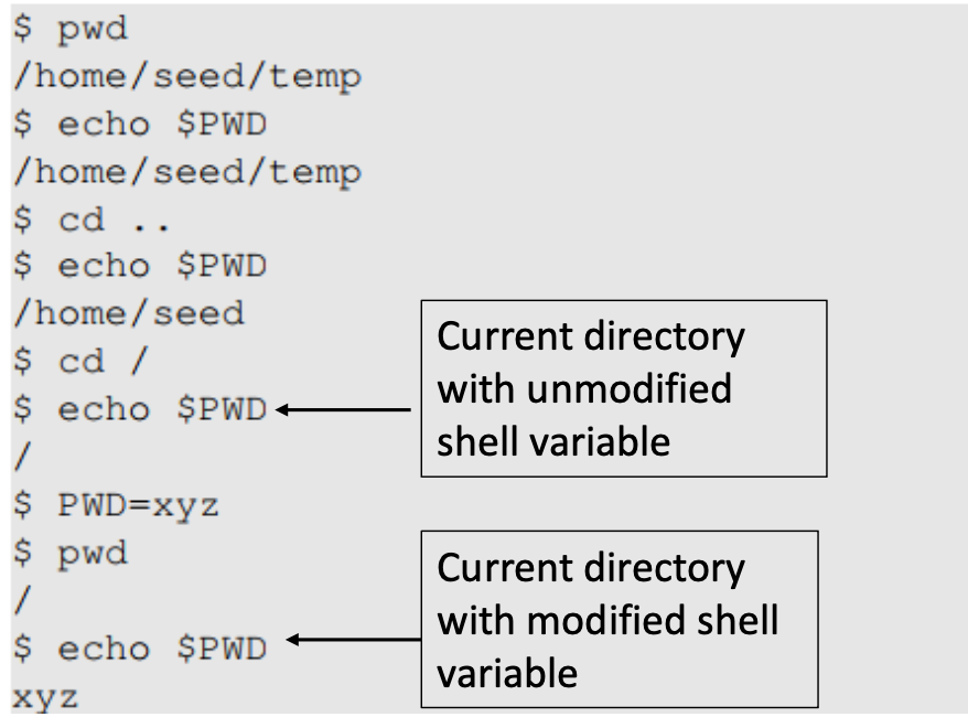 또한 pwd는 쉘에 의해 갱신되서 우기가 임의로 pwd값을 변경할수도 있다.