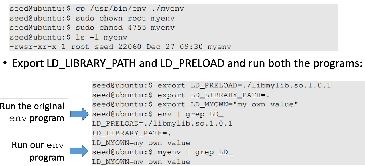 그 이유는 보안상으로 EUID와 RUID가 다르면 LD_PRELOAD와 LD_LIBARY_PATH 환경변수를 무시하게 되어있기 때문이다.