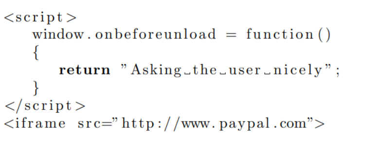 이 코드에서 onbeforeunload가 다른 사이트로 나가려고 할 때 경고창의 띄운다.