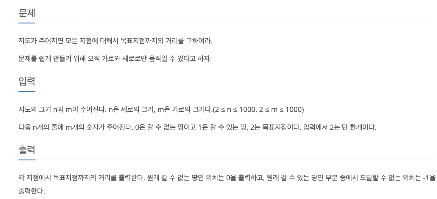 지도가 주어지고 각 위치마다 목표지점까지 얼마나 걸리는지를 출력하는 문제이다.
