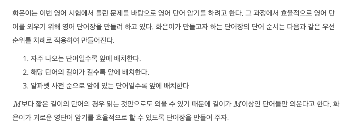 단어를 입력받을 때, 단어가 조건의 길이를 넘기면 해시맵에 해당 단어를 넣는다.