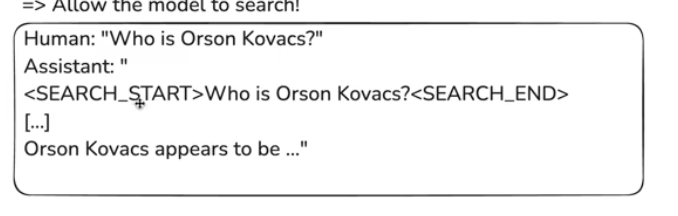 이렇게 모르는 질문이 들어왔을 때, search_start와 같은 특수 토큰을 출력한다. 이것은 bing.com과 같은 곳으로 가는 쿼리가 된다. 모델은 쿼리를 실행하고, search end를 출력한다. 여기서 이 다음 시퀀스의 다음 토큰을 샘플링하는 대신, 실제 모델에서 생성을 일시 중단하고, bing.com과 같은 세션을 열고 검색어를 붙여 넣고, 검색에서 가져온 모든 텍스트를 받는다.