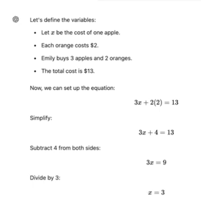 어시스턴트 1: "정답은 $3입니다. 오렌지 2개는 개당 $2이므로 총 $4입니다. 따라서 사과 3개의 가격은 $9이고, 각각의 사과 가격은 $9 ÷ 3 = $3입니다."