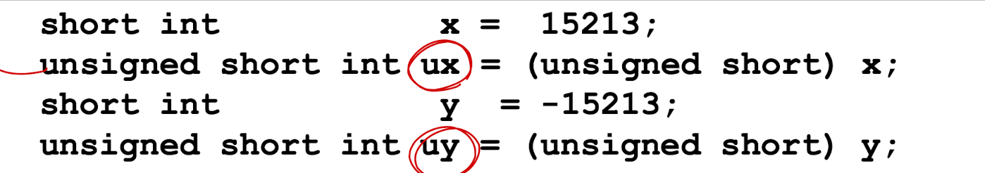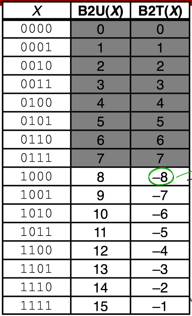 하지만 부호형은 -2^(w-1)에서 2(w-1) -1까지 나타낼 수 있다. 양수 범위가 더 적은 이유는 맨 앞 비트가 0일 때는 모든 비트가 0인 0도 포함이기 때문