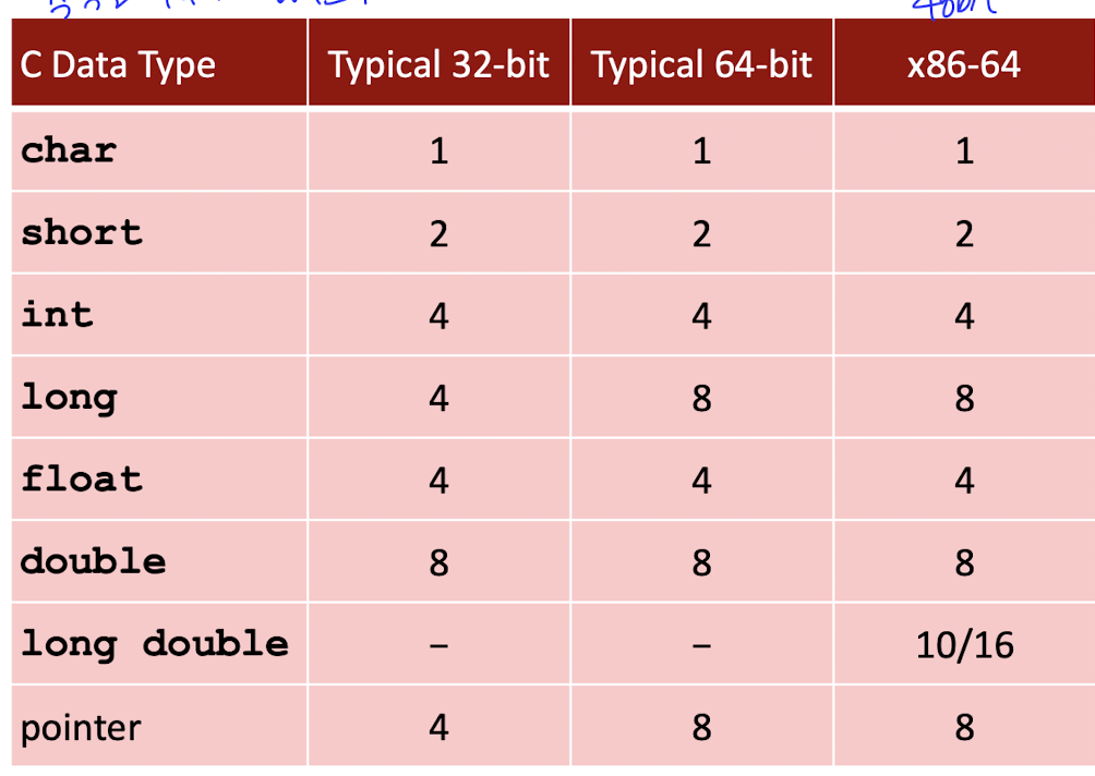 32bit, 64bit, 48bit 컴퓨터에서는 각각의 자료형을 위와 같은 수의 byte로 표시한다.