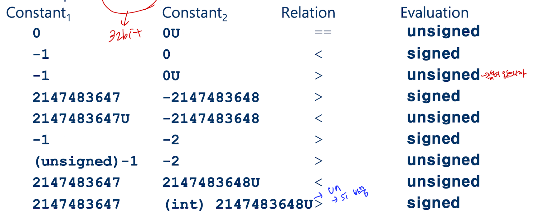 일단 위 표를 설명하자면, 앞서 설명했다시피 부호형에서 양수는 2^(w-1)-1까지, 음수는 -2^(w-1)까지 표현 가능하다. 표에서 이 범위 안에 있는 값들은 실제 결과에서도 동일하게 표시되는 것도 가능하다.