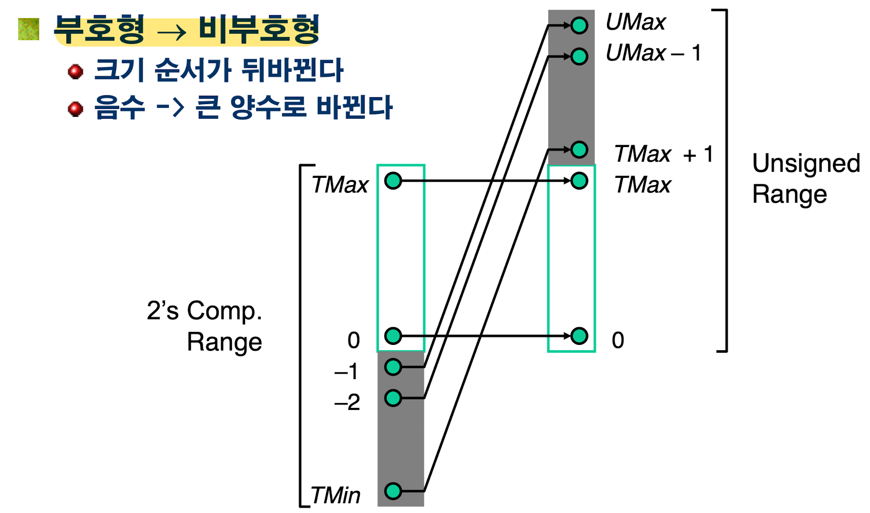 부호형이 비부호형으로 바뀔 때는 앞서 언급했듯이, 양수 부분은 그대로 바뀌고, 음수 부분은 기존 양수보다 더 큰 값으로 바뀐다.