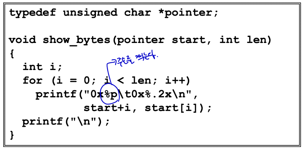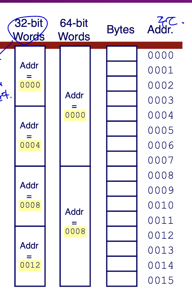 이 때 하나의 정수의 주소는 메모리에서 한 덩어리(8byte)의 첫번째 위치이다. 따라서 연속된 워드의 주소는 4또는 8 바이트씩 증가한다.