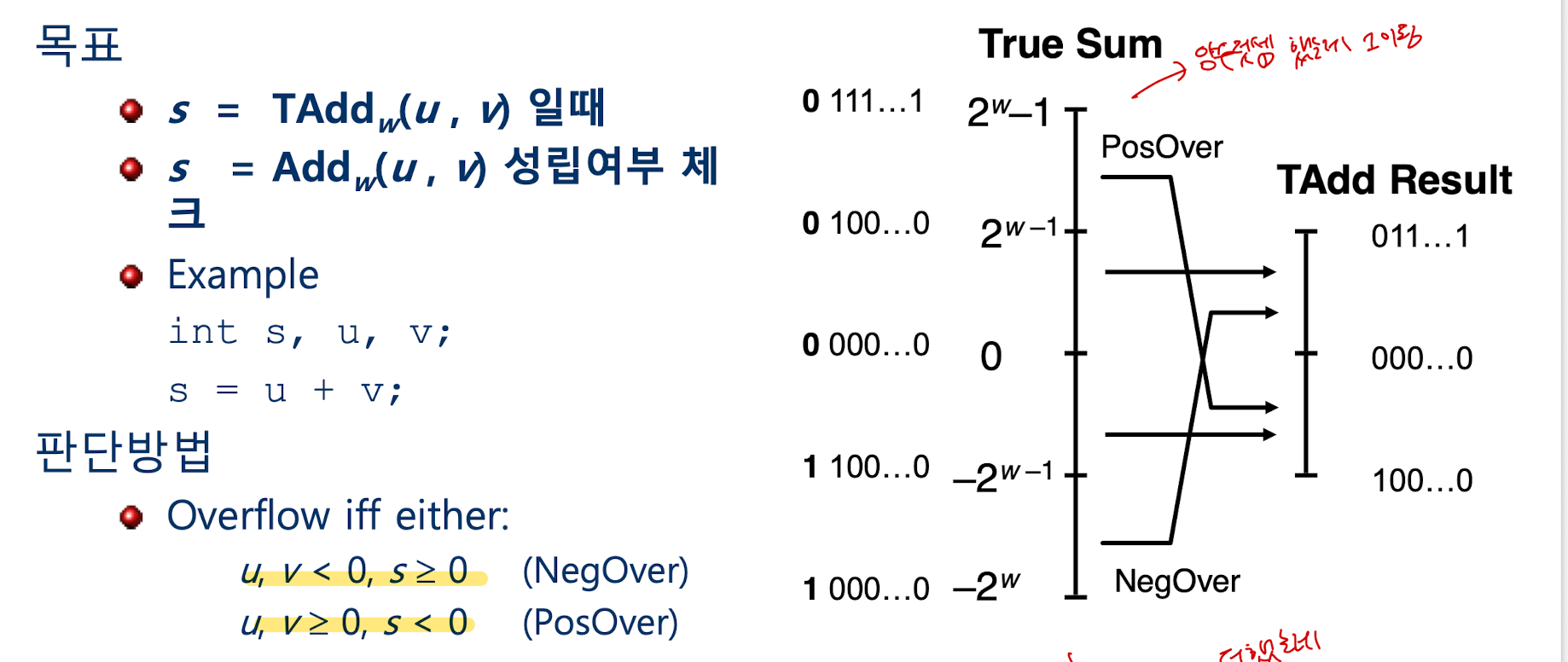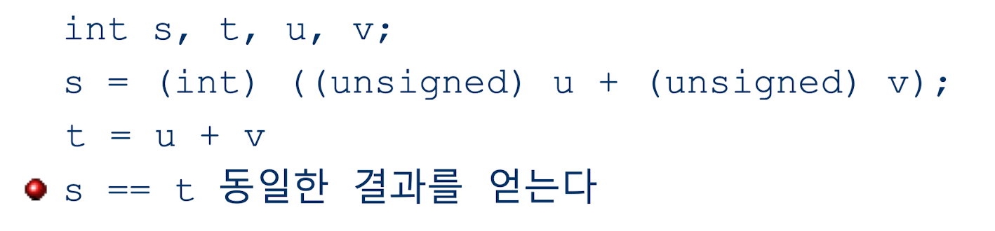 즉 부호형인 u와 v를 비부호형으로 변환해서 더한 후, 다시 부호형으로 변환한 값과, 그냥 부호형 상태로 둘이 더한 값은 동일하다.