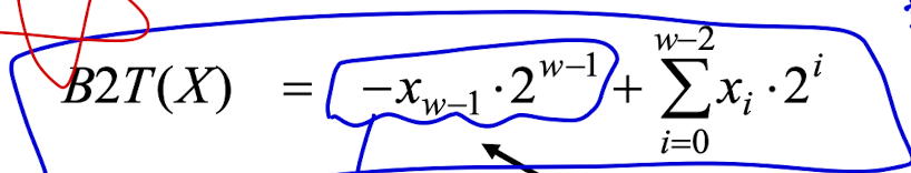 가장 큰 자리는(2^(w-1)) 마이너스를 곱하고, 나머지 자리들은 더하는 방식이다.