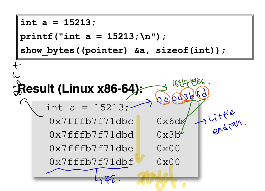 다음과 같이 a변수에 15213을 넣었다고 하자. 15213은 16진수로 0x00 00 3b 6d이다.