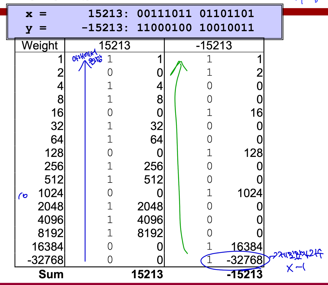 위 과정은 15213과 -15113을 나타내는 이진수를 10진수로 바꾸는 과정을 설명한다.