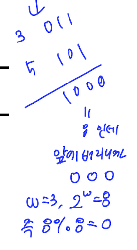 우리는 캐리를 버리니까 000만 나온다. 즉 답은 0이 나온다는 말이다. 이 0은 원래 정답이었던 8과 2^w인 8을 mod한 값이다(8나누기8의 나머지는 0이니까)
