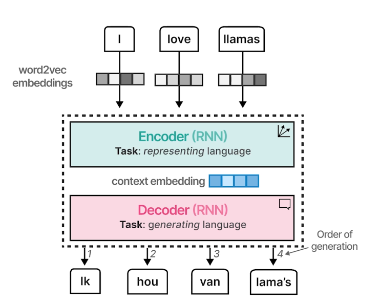 이 과정을 통해 인코딩에서는 하나의 임베딩 형태로 문맥을 생성하고, 디코더는 이 문맥 임베딩을 이용해 출력 문장을 사용한다.