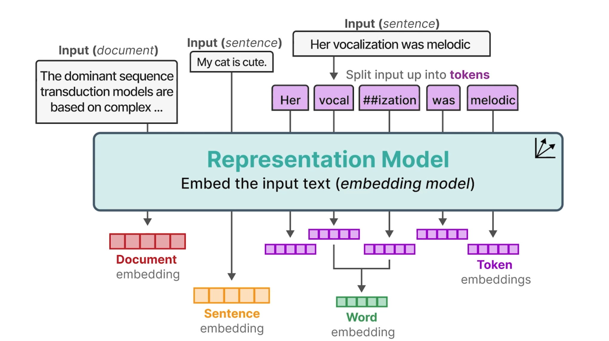 위 예시는 단어 단위의 임베딩이지만, 임베딩 종류는 다양하다. word2vec처럼 텍스트를 임베딩으로 변환하는 모델을 Representation Model이라고 한다.
