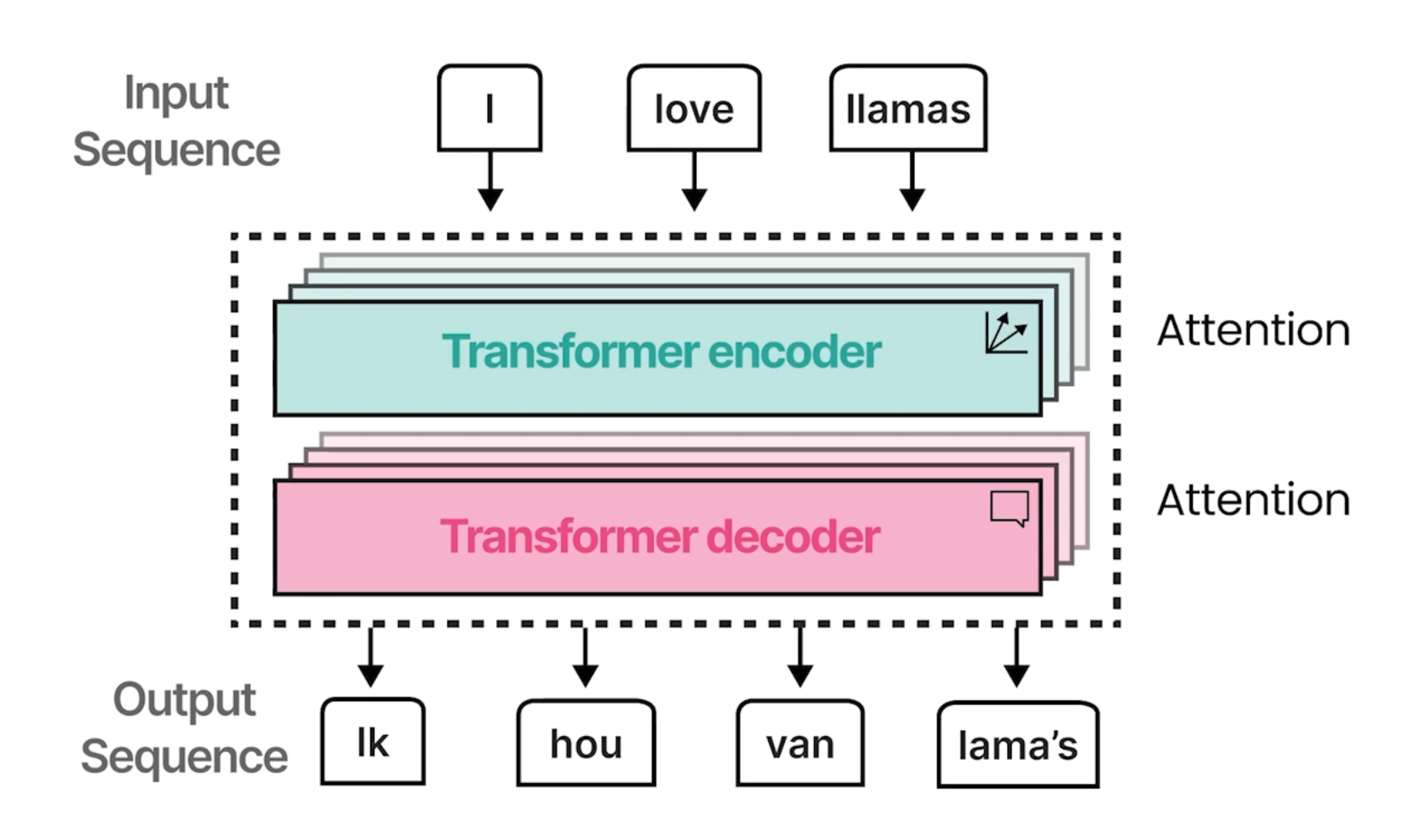 i love llamas는 ik hou van lama's로 번역된다. 이 아키텍쳐의 각 단계는 autoregressive하다. 즉, 다음 단어를 생성할 때 이전에 생성한 모든 단어를 계속 참조한다.