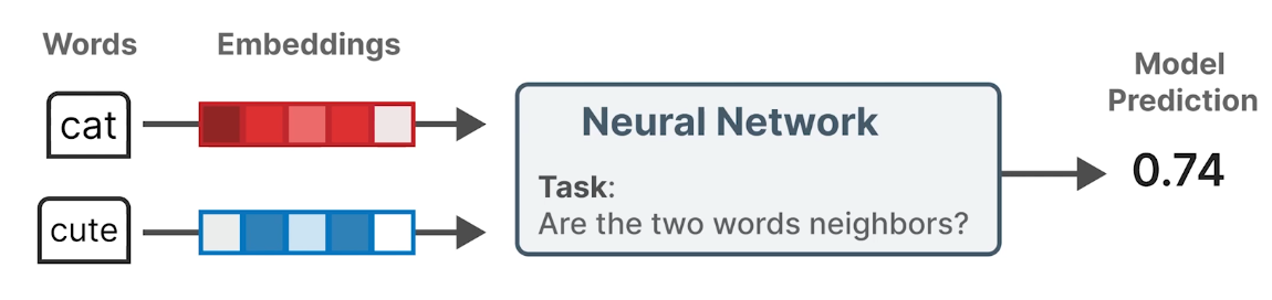 학습 과정에서 단어 간 관계를 파악하여 embedding에 정보를 압축하고, 이웃이 비슷한 단어는 embedding이 서로 가까워지고, 그 반대면 서로 멀어진다.