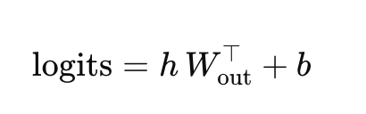 이건 각 토큰별로 계산을 해서 어떤 토큰이 가장 다음에 올 확률이 높은지 계산하는 수식이다. 여기서 h는 문맥이다. 즉 "고구마처럼 맛있는"을 self attention 등으로 히든벡터로 만든 것이다.