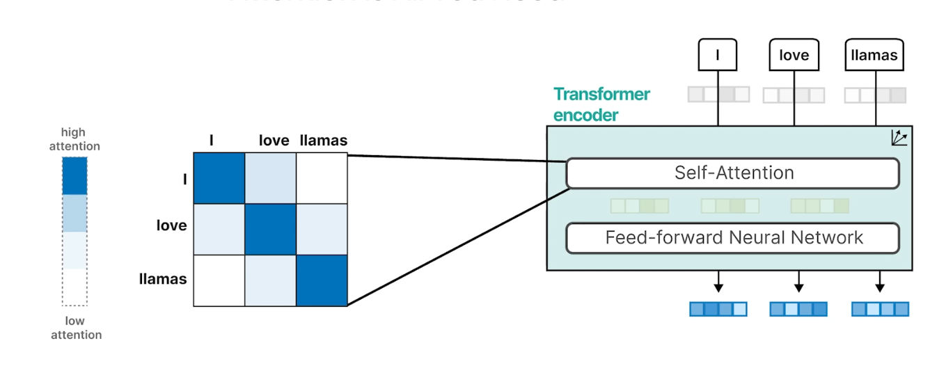 아까와 같은 사례를 적용하면 위와 같이 단어가 연관이 있을 때에는 높은 어텐션을, 연관성이 낮을때는 낮은 어텐션을 가진다.