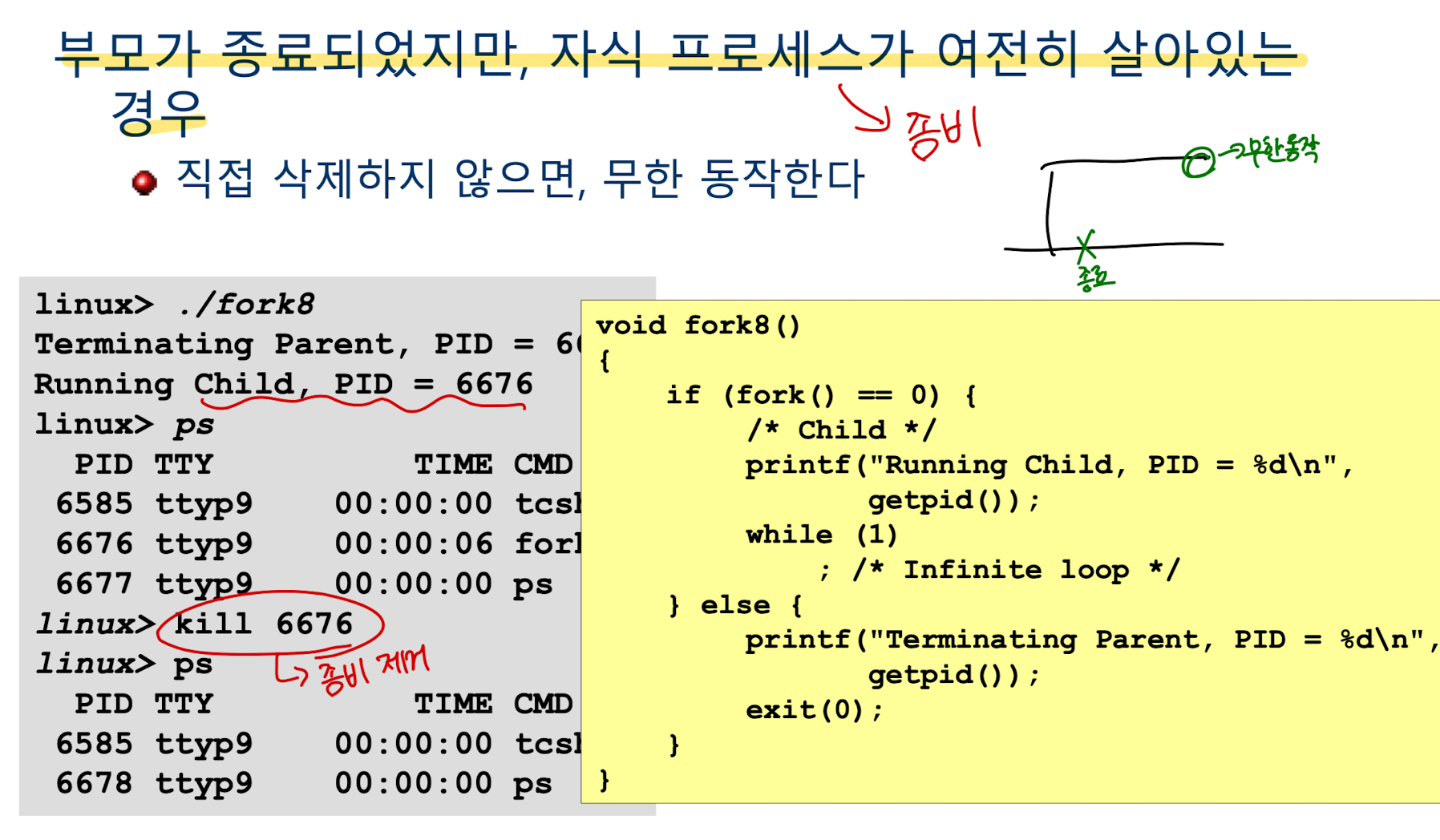 이 경우 자식은 고아 프로세스가 된다. 이 때도 마찬가지로 자식 프로세스를 죽이면 init()이 자식프로세스를 정리해준다.