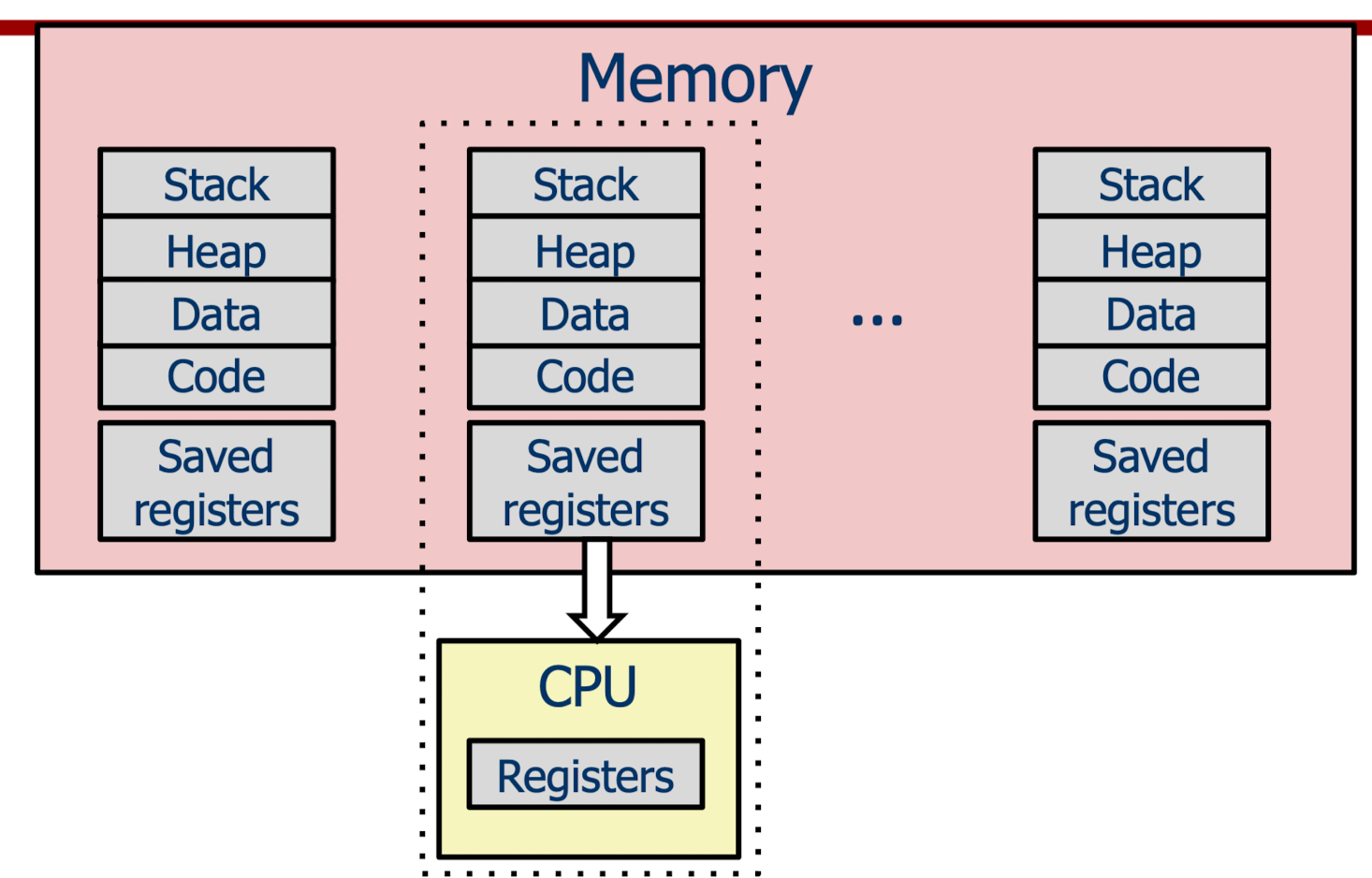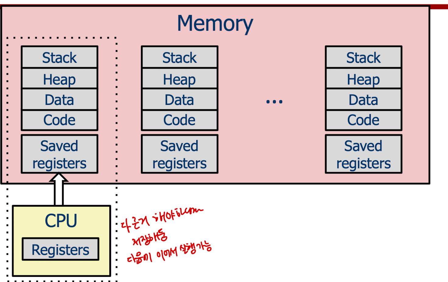 하나의 프로세스를 수행하던 중 다른 프로세스를 실행할 때에는 기존의 레지스터들을 메모리에 보관하고 다음 프로세스를 실행하기 위해 스케줄링(어떤 프로세스를 얼마나 실행할것인지)를 진행한다.