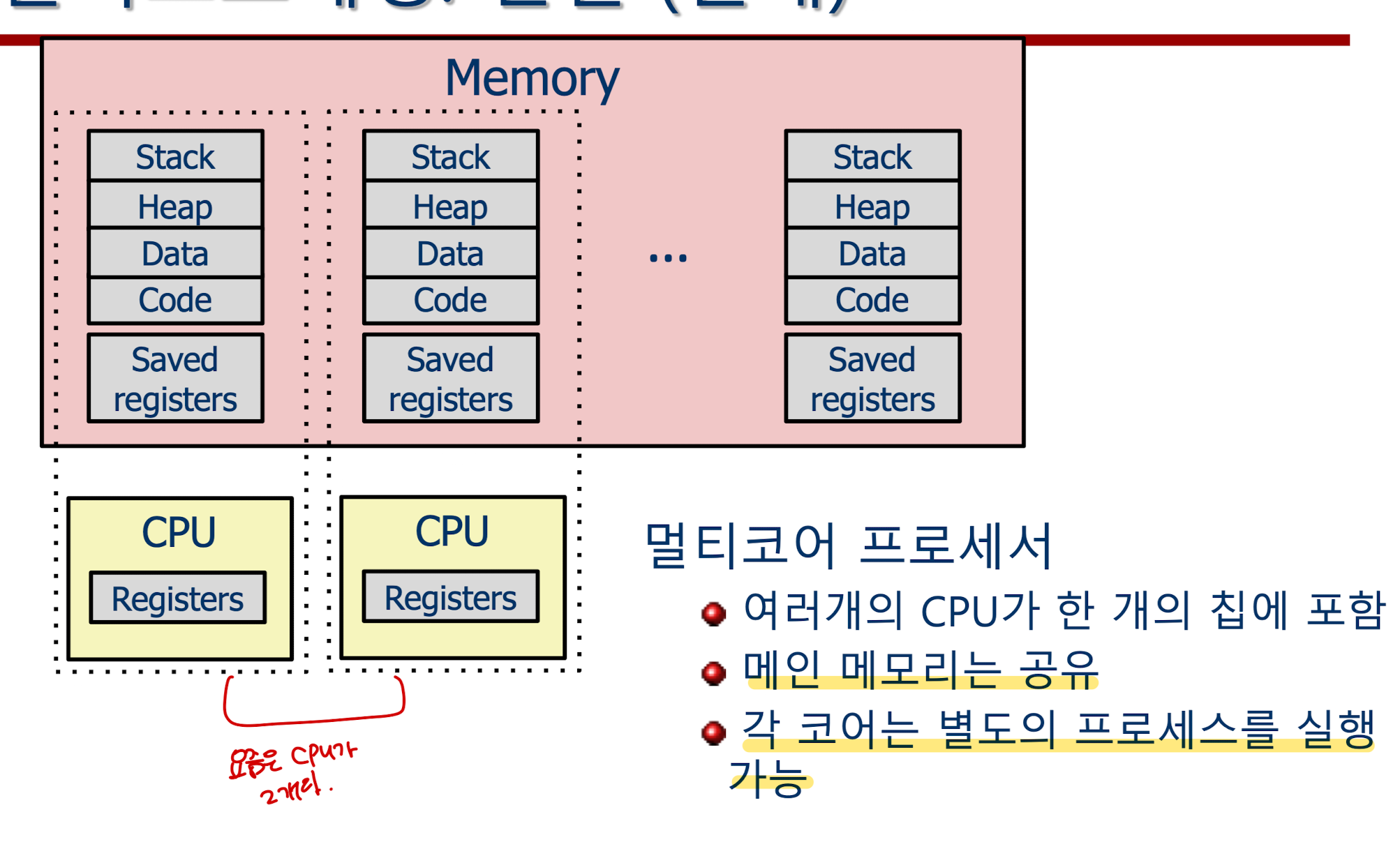 여러개의 cpu가 한개의 칩에 포함되어있고, 메인메모리는 모두 공유한다. 각 코어는 별도의 프로세스를 실행 가능하다.