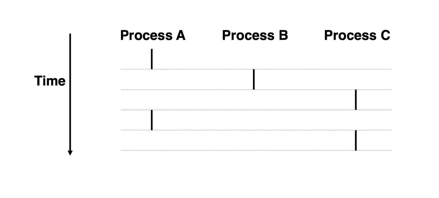 두 프로세스가 실행되는 시간이 서로 중첩되면 동시에 실행된다고 부르고 그렇지 않으면 순차적으로 실행된다고 정의한다.