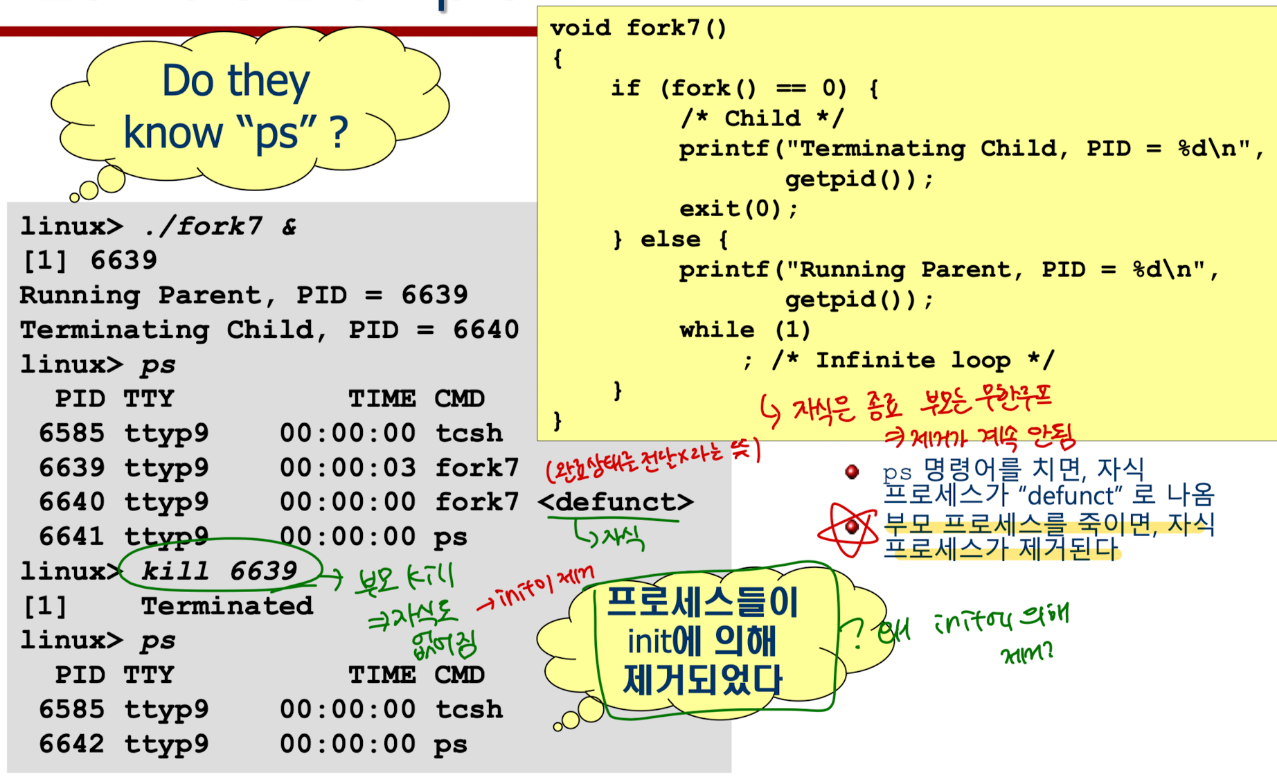 이 때 부모 프로세스 pid인 6639를 kill을 활용해서 죽이면, init 프로세스가 해당 부모의 자식프로세스를 입양하여 자식 좀비를 제거한다.