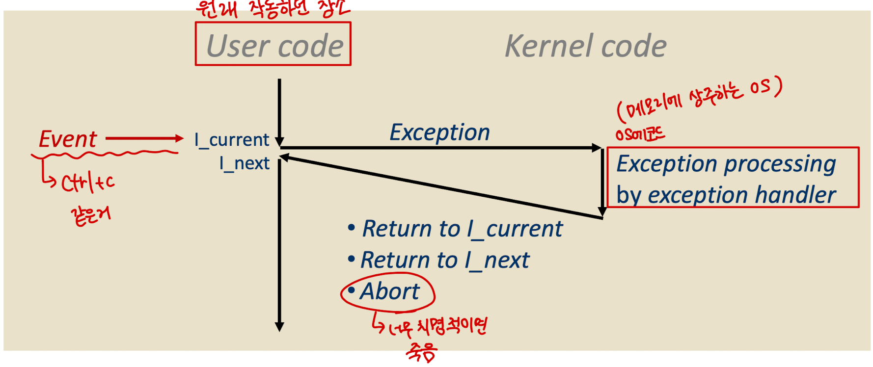 cpu가 user의 code(현재 사용하던 프로그램)을 실행하다가, exception(0으로 나누는 상황)이 발생하면 메모리에 상주하는 os 코드(handler)를 실행하여 이를 해결한다.