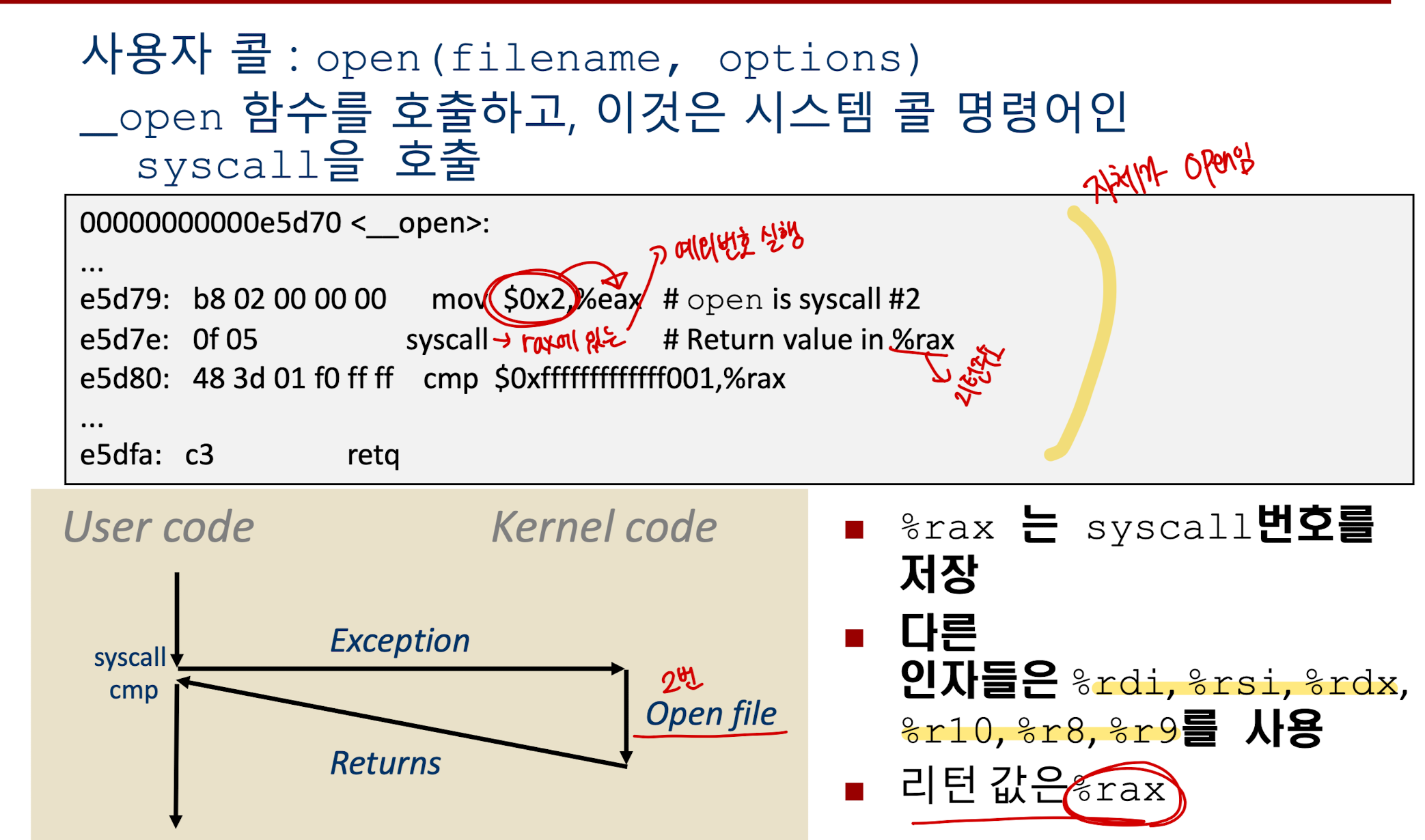 그 다음 syscall을 호출하여 커널에 진입힌다. 커널 내의 open file을 실행한 후, 리턴한다.