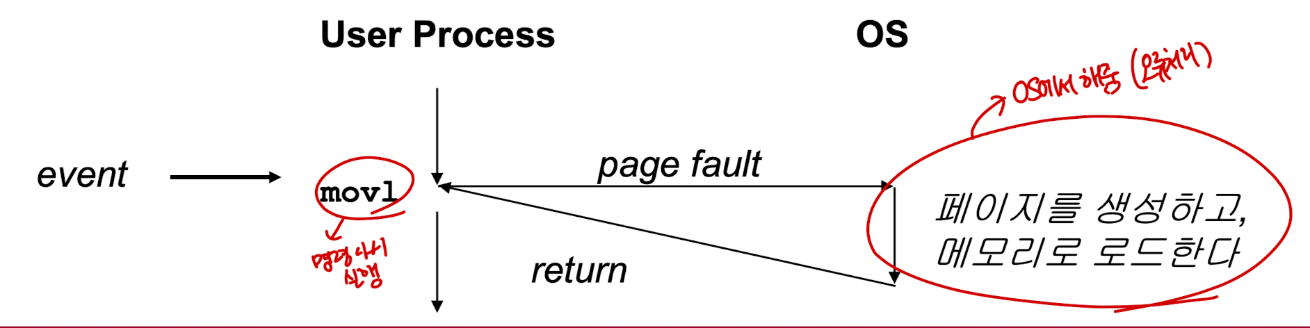 이 경우, os가 페이지를 생성하여 메모리에 로드한 후, 이전에 에러가 났엇던 movl 명령어를 다시 실행하는 방식으로 진행된다.
